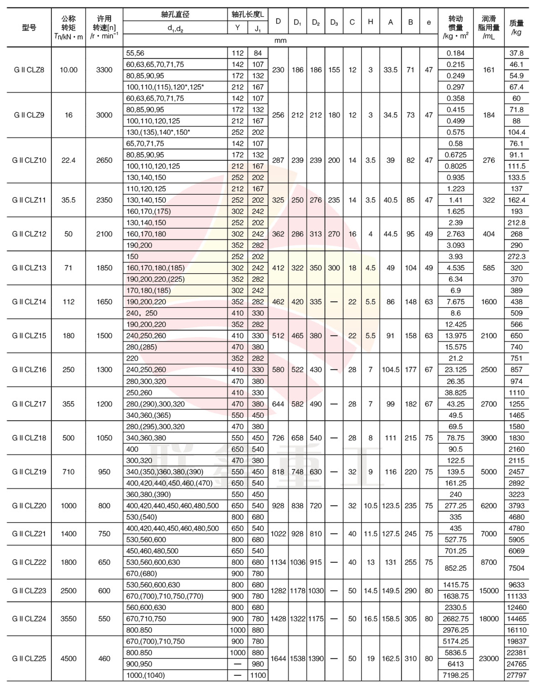 GIICLZ型鼓形齒式聯(lián)軸器 特點及應(yīng)用場合:具有少量軸線偏移補償性能,不能緩沖、減振。外形尺寸小,理論上傳遞轉(zhuǎn)矩大,需要潤滑、密封,但噪聲較大、價格貴,用于聯(lián)接水平兩同軸線軸系傳動。用于低速、重載工況條件下聯(lián)接水平兩同軸線,如冶金機械、重型機械等。不適用于高速、高精度的軸系傳動,起動頻繁、正反轉(zhuǎn)多變的工況不宜采用。
