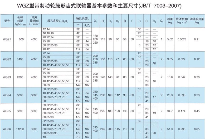 WGZ帶制動輪鼓形齒式聯(lián)軸器的參數(shù)及尺寸:(JB/T 7003-2007) mm