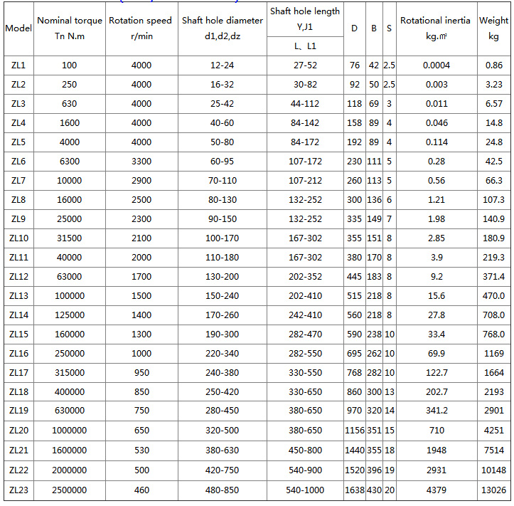 ZL (LZ) type pin gear coupling characteristics and application: It can compensate the relative offset of two axes, the vibration damping function is poor, the transmission precision is low, the transmission torque is large, and the structure is simple compared with the gear coupling. , light weight, easy to manufacture, easy to maintain. It does not need lubrication, and partially replaces the gear coupling. It has high noise and is suitable for large and medium torque shaft drive. It is not suitable for the parts with high requirements for vibration reduction and strict control of noise.