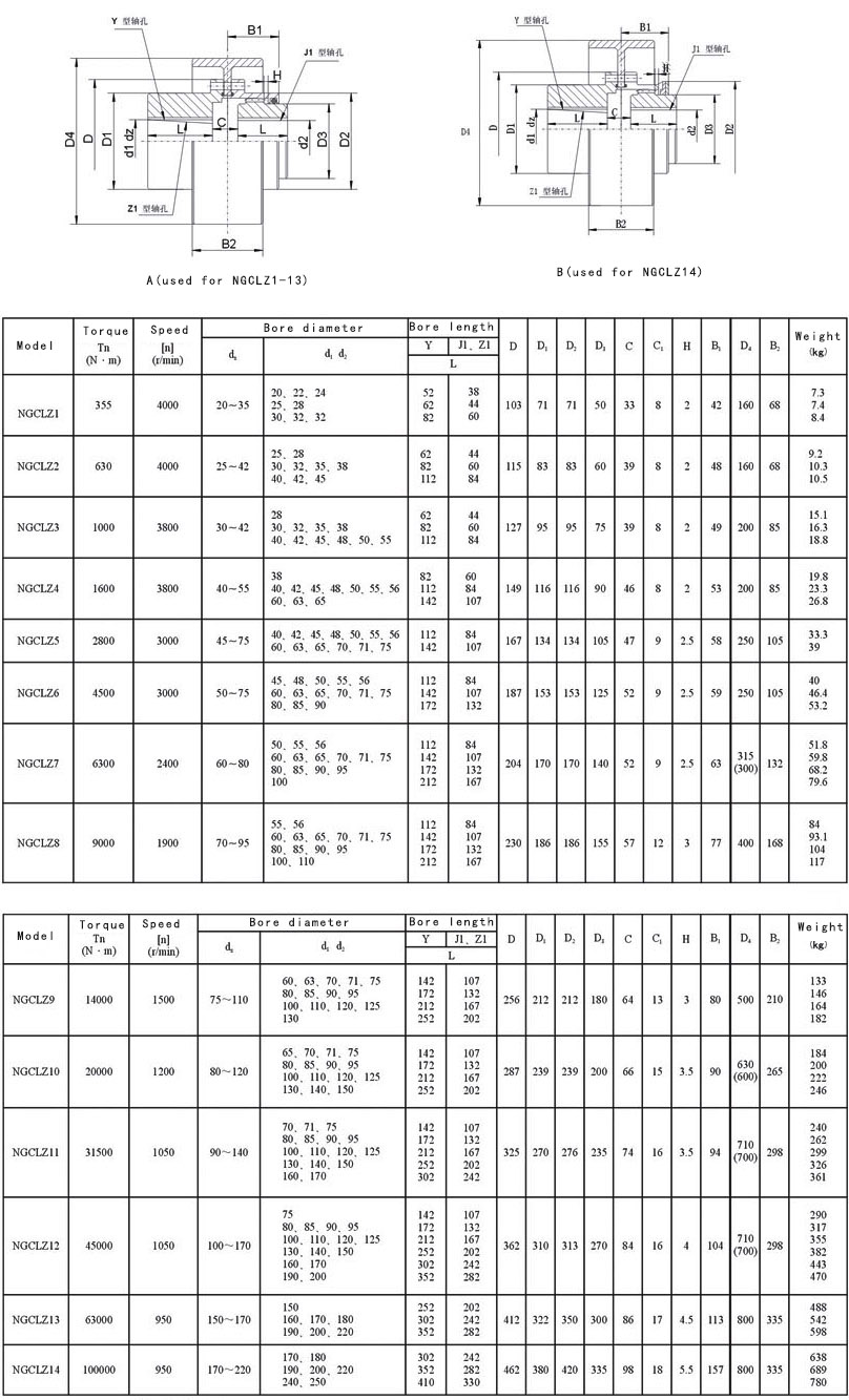 NGCLZ drum type gear coupling is a kind of drum gear coupling. The difference is that the common drum coupling is NGCLZ with brake drum crown gear coupling. The moving wheel can adjust the rotation speed of the machine by controlling the rotation speed of the brake wheel. Compared with spur gear couplings, NGCLZ with brake drum crown gear coupling allows for greater angular displacement, improves tooth contact conditions, improves torque transmission, extends service life, and has angular displacement. The contact state along the tooth width is composed of an inner ring gear having the same number of teeth and a flange half coupling with outer teeth. NGCLZ with brake drum crown gear coupling, the two shafts produce relative angular displacement. The tooth surfaces of the inner and outer teeth periodically slide axially relative to each other, which inevitably forms tooth surface wear and power consumption. Therefore, NGCLZ belt system The moving drum crown gears need to work in a good and sealed condition. The NGCLZ drum-type gear coupling has the same radial size and large bearing capacity as the gear coupling. It is often used for shaft transmission in low speed and heavy load conditions, high precision and dynamic balance gear. The coupling can be used for high speed drives. For use with brakes, for metallurgical machinery and heavy machinery requiring braking components NGCL type - basic type with brake wheel; NGCLZ type - with brake wheel connected intermediate shaft type; ![]() |