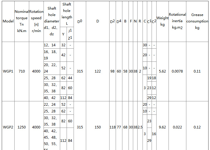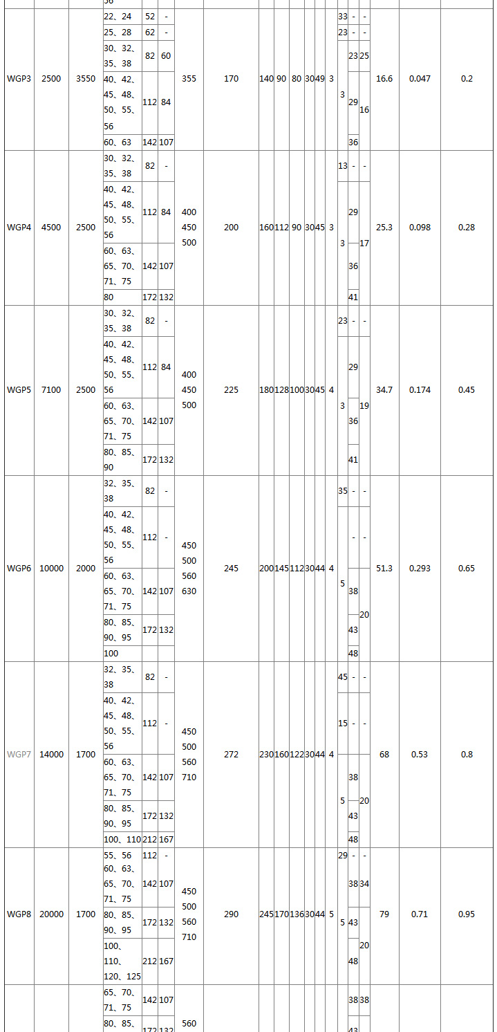 WGP with brake disc drum gear coupling belongs to the drum type gear coupling, abbreviated as "tooth gear coupling", WGP with brake disc drum gear coupling has a brake disc, The rotational speed of the machine can be adjusted by controlling the speed of the brake disc. As shown in the figure, the WGP with brake disc crown gear coupling is divided into two types, I type and II type. The only difference is that the shape of the brake disc is different. WGP with brake disc crown gear coupling is a modified version of the toothed coupling, allowing for greater angular displacement relative to the spur gear coupling, improving tooth contact conditions and increasing transmission torque The ability to extend the service life, the contact state along the tooth width with angular displacement, consists of the inner ring gear with the same number of teeth and the flange half coupling with external teeth. WGP with brake disc crown gear coupling, the two shafts produce relative angular displacement during operation. The tooth surfaces of the inner and outer teeth periodically slide axially relative to each other, which inevitably forms tooth surface wear and power consumption. Therefore, the tooth type The shaft must work in a good and sealed condition. The gear coupling has small radial dimension and large bearing capacity. It is often used for shafting transmission under low speed and heavy load conditions. The high precision and dynamic balance gear coupling can be used for high speed transmission. WG type - basic type; WGP type - with brake disc type, suitable for matching with disc brakes; WGZ type - with brake wheel type, suitable for supporting with tile brakes; WGT type - connected to the middle sleeve type, suitable for two-axis long-distance connection, the allowable speed [n] depends on the length and quality of the intermediate sleeve, and the critical speed should be checked; WGC type - vertical installation type, used to connect vertical two-axis shaft drive; Type I--The sealed end cap is of separate type with large tooth spacing, which can allow large radial displacement and can be connected with Y, J1 and Z1 shaft extensions; ![]() ![]() ![]() ![]() |