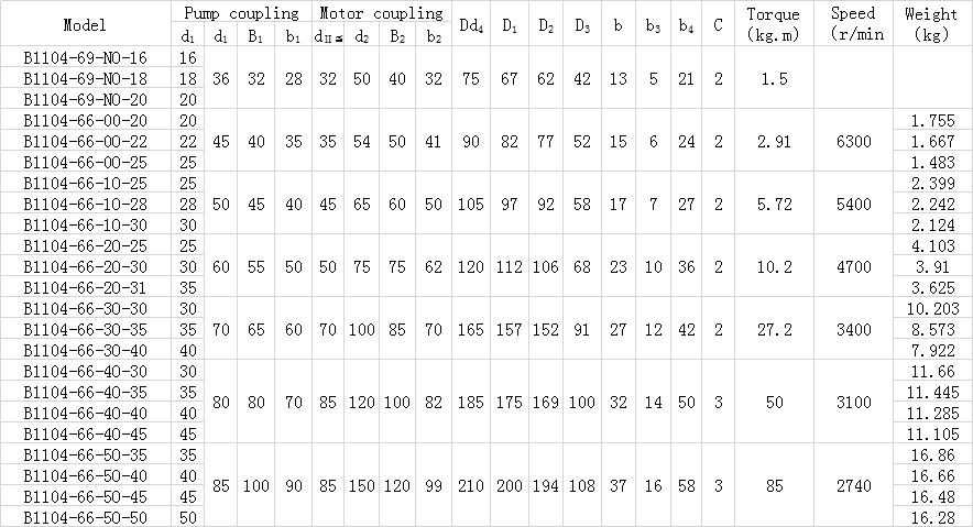 5 The standard code of the pump industry is Bl104, the maximum allowable torque is 850N·m, and the maximum shaft diameter is 50mm.