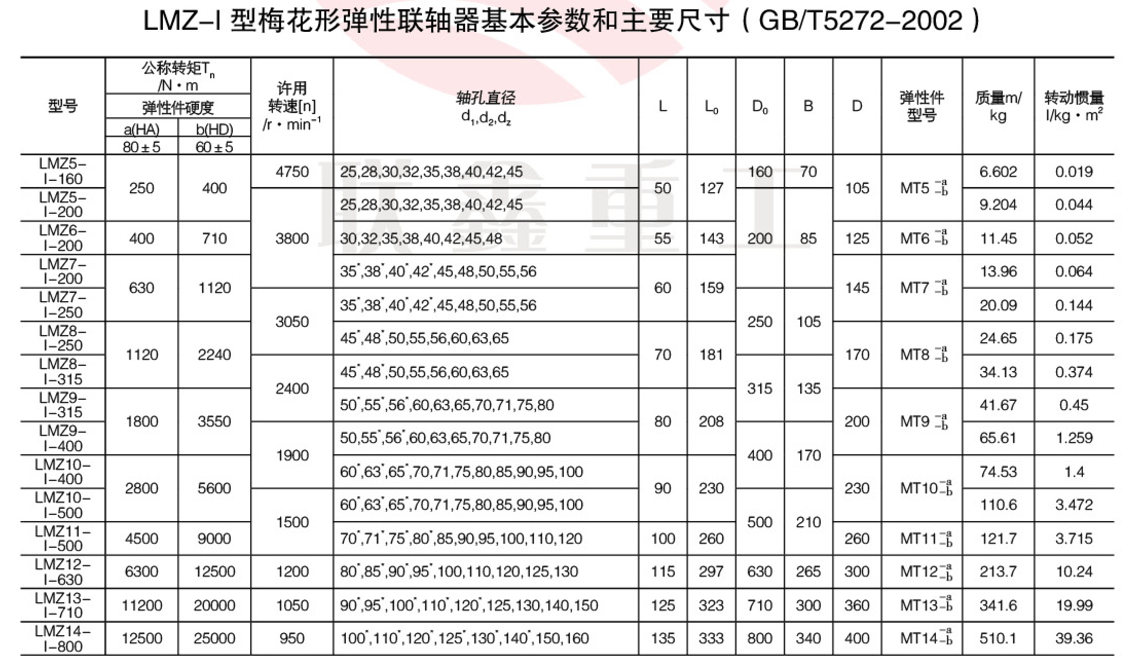 MLL-I(LMZ-I)梅花聯(lián)軸器 特點(diǎn)及應(yīng)用場(chǎng)合:具有補(bǔ)償兩軸相對(duì)偏移、減振、緩沖性能、徑向尺寸小,結(jié)構(gòu)簡(jiǎn)單、不用潤(rùn)滑、承載能力較高,維護(hù)方使、更換彈性元件需軸向移動(dòng) (MLS型除外),適用于聯(lián)接同軸線,起動(dòng)頻繁,正反轉(zhuǎn)變化,中速、中等轉(zhuǎn)矩傳動(dòng)軸系和要求工作可靠性高的工作部位。不適用于重載、低速及軸向尺寸受艱制,更換彈性元件后兩軸對(duì)中困難的部位。