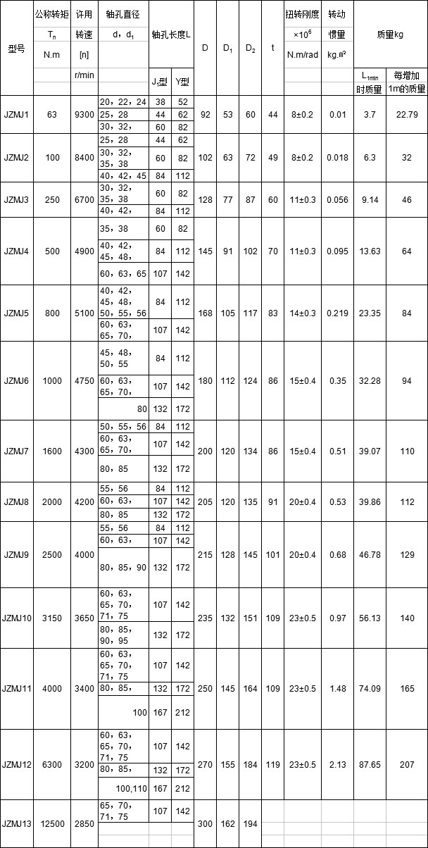 JZMJ型重型機(jī)械用膜片聯(lián)軸器的參數(shù)及主要尺寸: (JB/ZQ 4717-98) mm